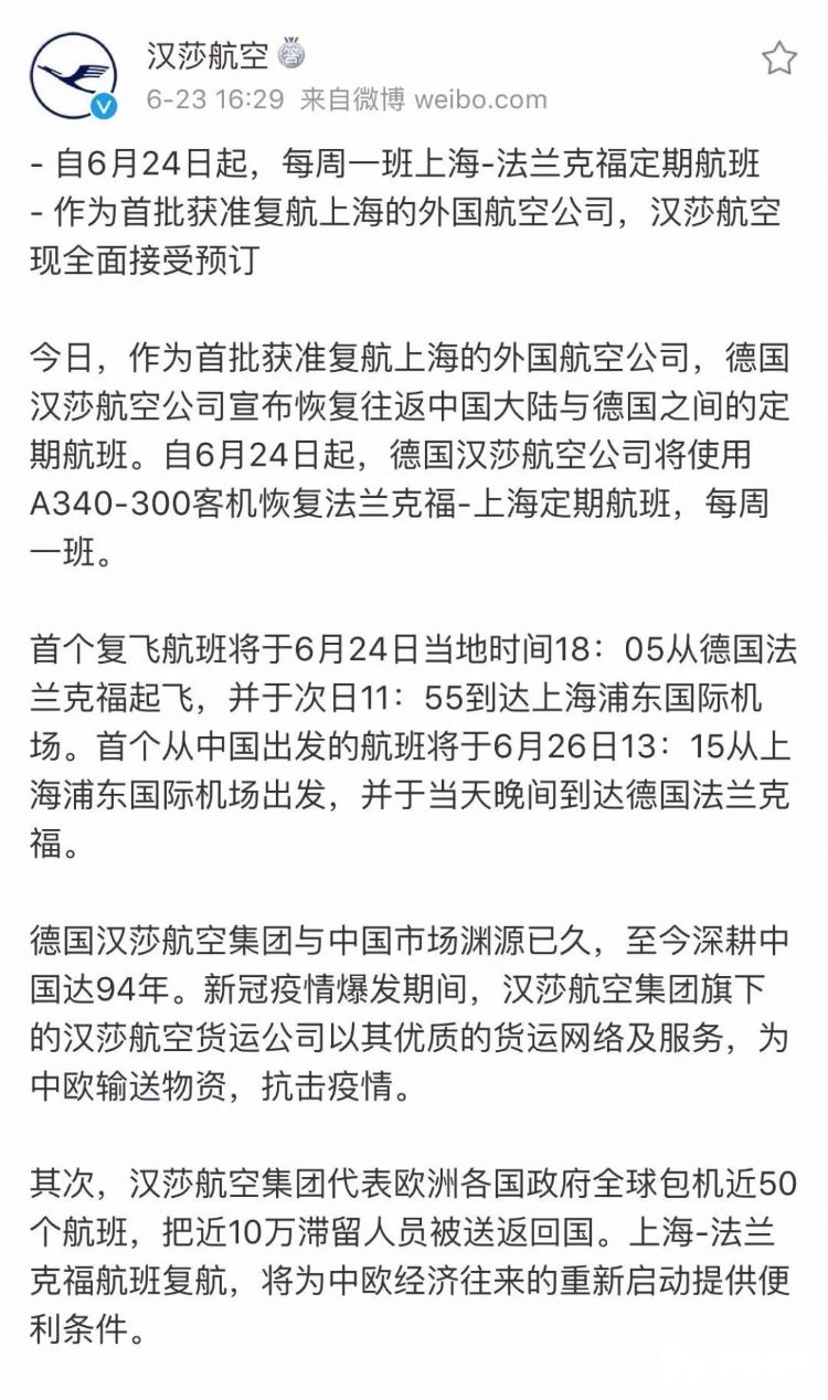 作为首批获准复航上海的本国航空公司,汉莎航空现片面接受预订