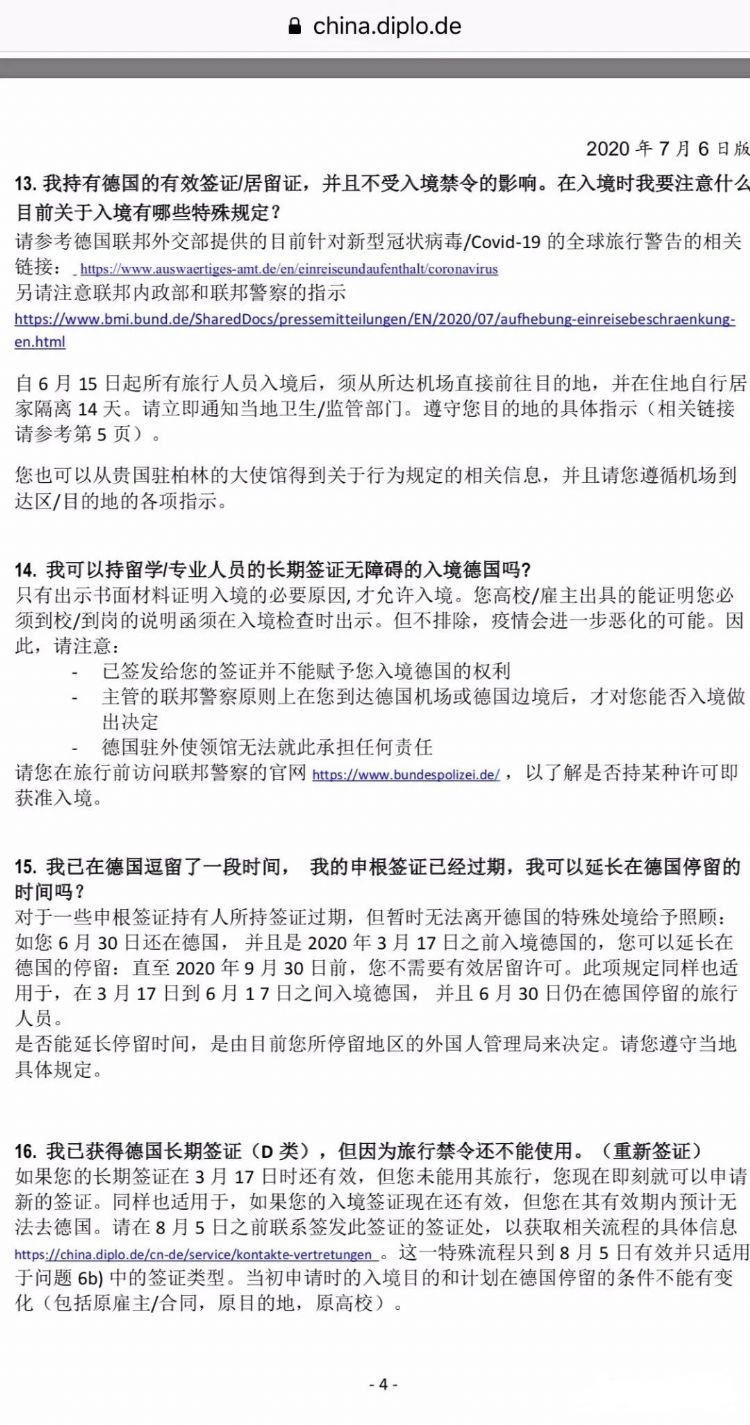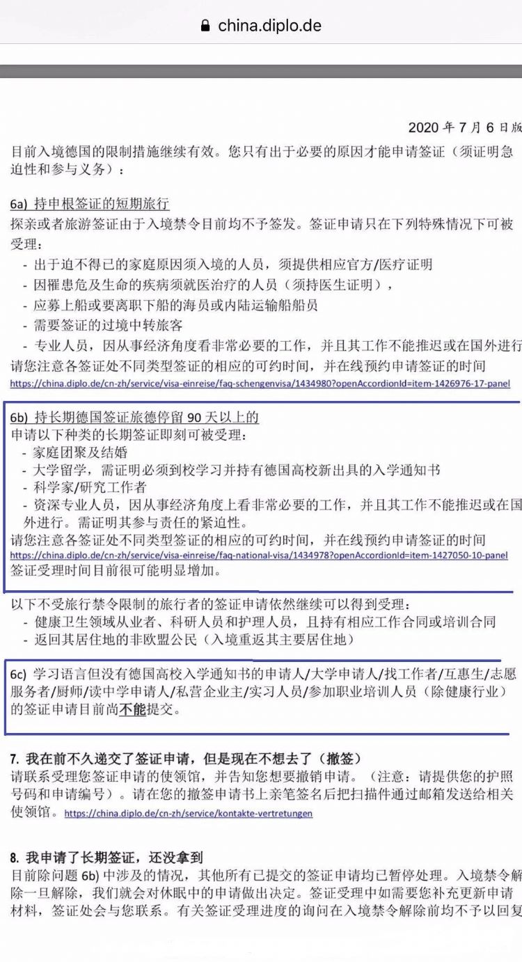 7月6日德国驻华使馆官网再次更新疫情期间签证要求关连动静。因为近期欧盟已宣告入境平等条例(你不让咱们出境,我也不让你们入境),所以这次限定出境须知,已明确显现几种类型的签证暂时还无法申请。
