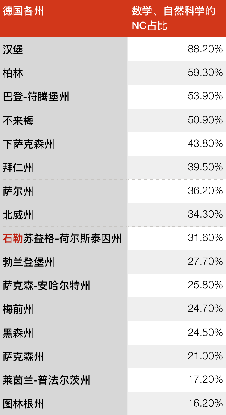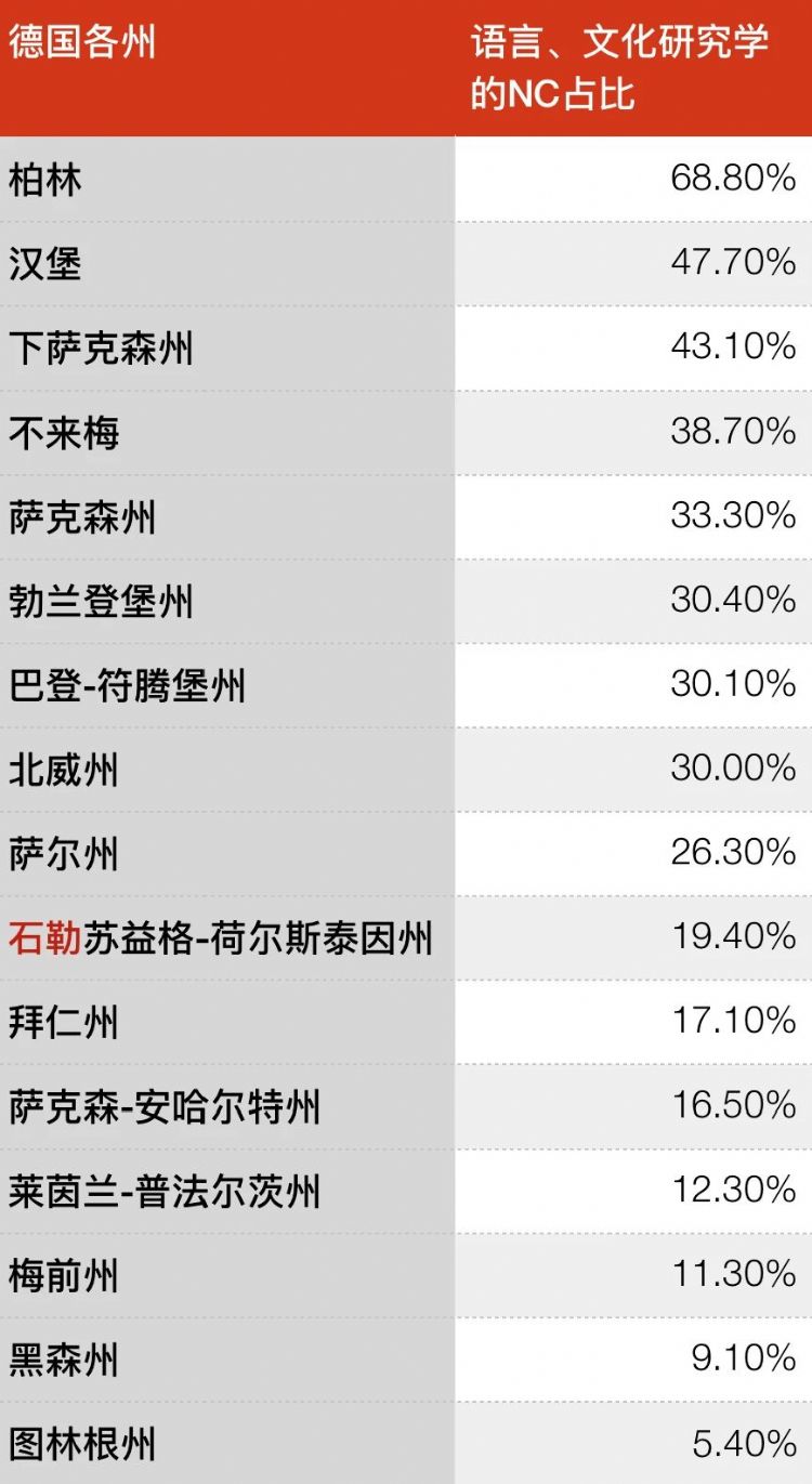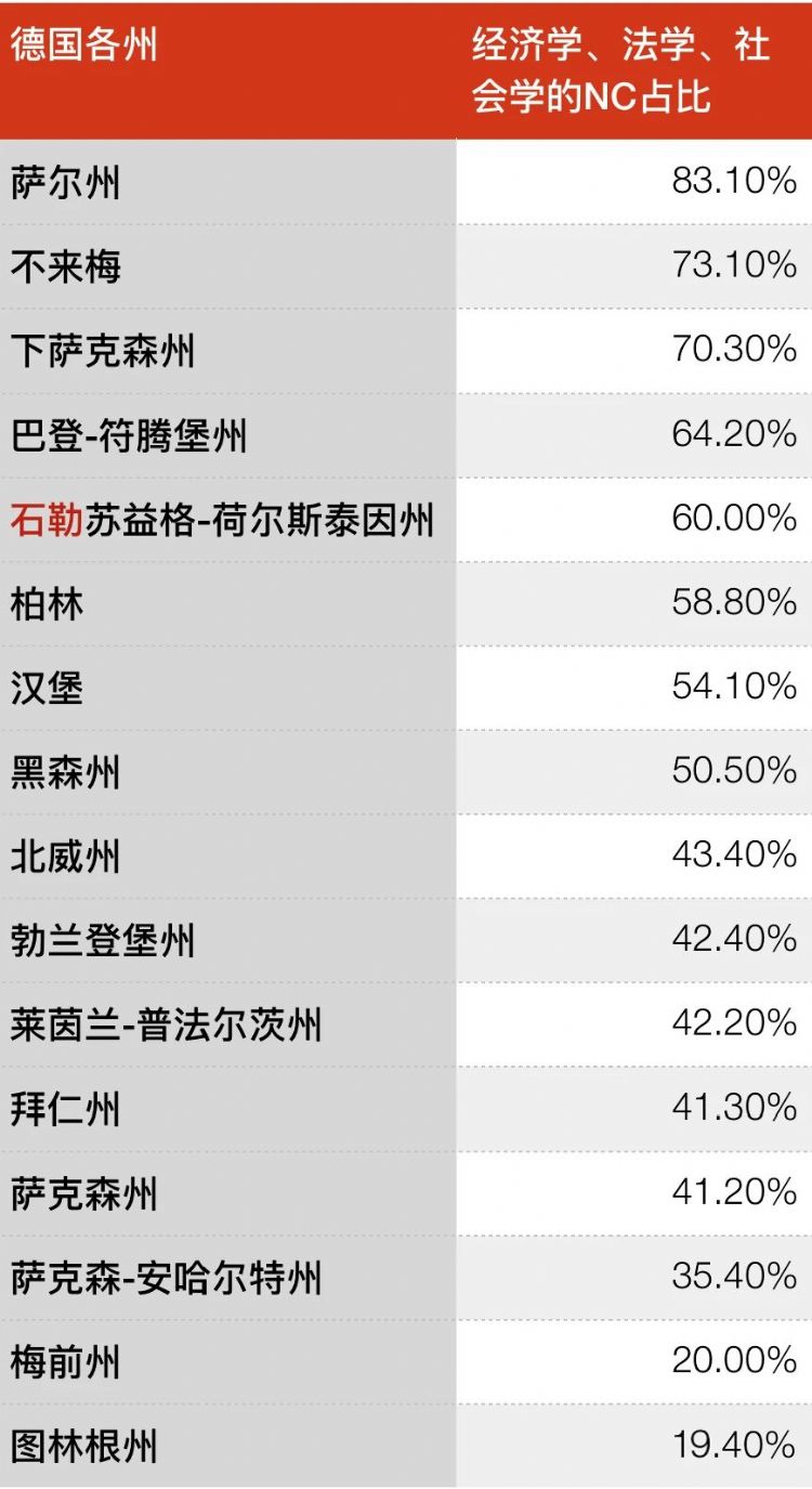 最高的NC占比是柏林,到达66.1%,而最低的图林根州的NC专业占比仅有19.4%,整整差了3倍还多!