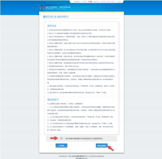 考生在规定时间内自行登录全国大学英语四、六级考试网站(网址为http://cet-bm.neea.edu.cn),点击相应栏目进行报名,完成用户注册、查证报名资格、个人信息确认、选择报考科目、网上缴费等报名手续。