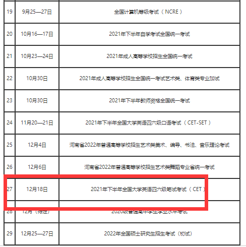 备战2021年12月英语四六级考试的同学们,2021年12月英语四六级的考试时间已经确定,根据河南省招生办公室发布的2021年度招生考试历可知,2021年12月大学英语四六级考试时间为12月18日,提前预祝同学们可以考试通过。