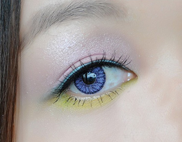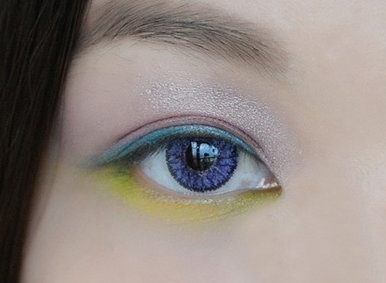 第三步是下眼线,柠檬黄色均匀地涂在眼睛下方中间位置,眼头和眼尾用浅绿色点缀,接近色的衔接其实也可以增加眼部的立体感哦。