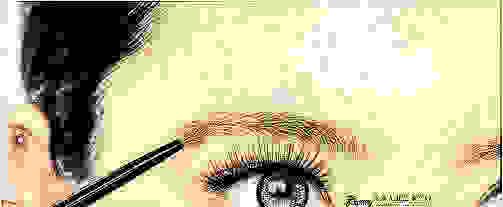 用化妆刷将眉粉混合后,从黑眼珠上方开始描画到眼尾。