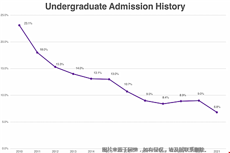 纵观以往录取率,从2010年到2018年,美国西北大学的录取率不断下降,从23.1%下降到8.4%,在最近两个应用周期中,这种趋势发生了逆转,2023年和2024年的录取率分别为8.9%和9.3%,但是随着大批量申请数,2021年美国西北大学的本科录取率也面临严重的下滑,达到近些年的最低点。