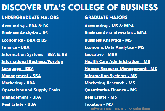 中心的下一代商业领袖提供卓越的教育体验方面发挥着至关重要的作用。美国德克萨斯大学阿灵顿商学院获得AACSB国际认证,被公认为全球前5%的商学院之一,并以向学生提供他们在职业和个人方面取得成功所需的技术技能和体验式学习机会而自豪。商学院学院通过学术、实习和研究计划为学生提供各种现实世界的机会,并拥有强大的55,000名校友网络,而且还在不断增加。所以无论是从地理位置还是校友等方面,美国德克萨斯大学阿灵顿商学院都是国际生不错的选择。