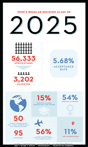 1、相比较去年,宾夕法尼亚大学录取率下降,国际生比率下滑,未来申请者难度有形中增加: