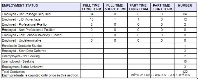 对于宾夕法尼亚州立大学法学院 2020届毕业生,77.05%的毕业生在毕业后10个月内获得了全职、长期的工作,这些工作要么需要律师资格,要么具有JD的优势;在毕业一年后,这个数字是83.61%。这些数字仅包括受雇于全职、长期需要JD或JD优势职位的毕业生。