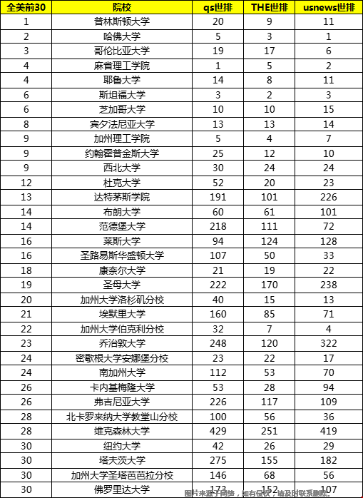 全美前30大学世界排名一览表