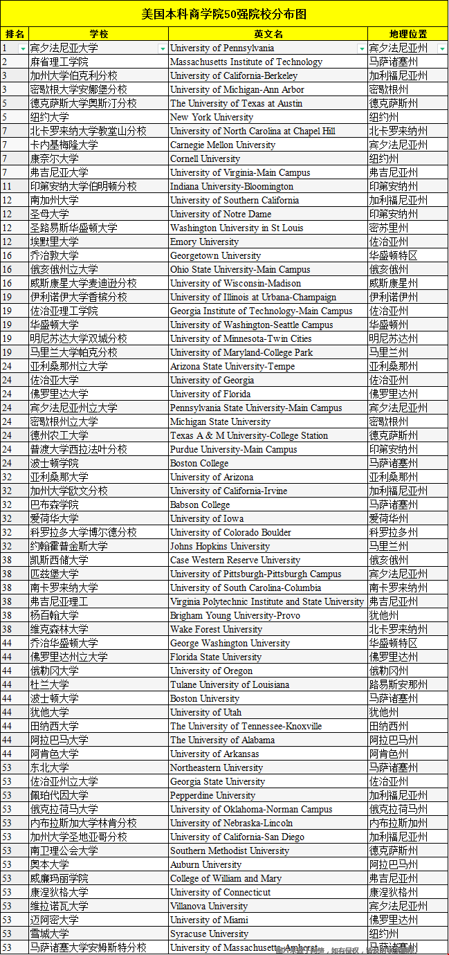 内附:美国本科商学院50强院校分布图