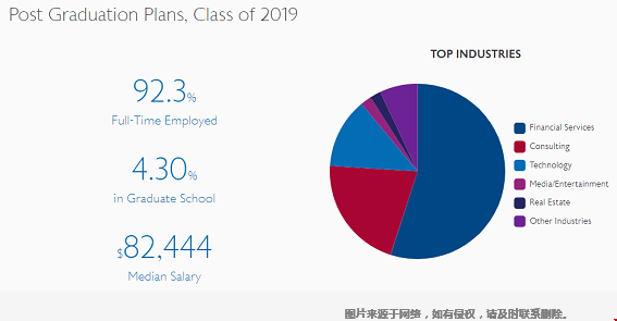 沃顿的毕业生就业率为92.3%,研究生就读率为4.3%。毕业学生大多就业与金融行业有关。薪资的中位数为82444美元/月。