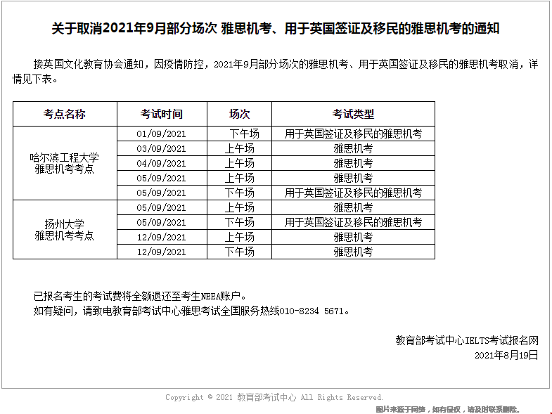9月份现在通知取消的雅思机考考试场次有:哈尔滨工程大学雅思机考考点、扬州大学雅思机考考点。