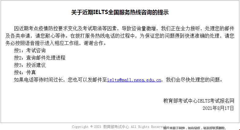 温馨提示:由于最近考场大面积取消比较突然,雅思官方提醒小伙伴们:在拨打服务热线电话的过程中,为了保证问题能够得到快速准确的处理,请务必按照语音提示进入相应工作组。