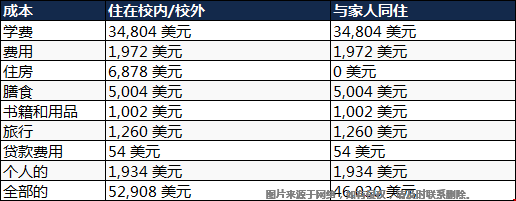 本科费用合计:住在校内/校外本:52,908美元/年;与家人同住:46,030美元