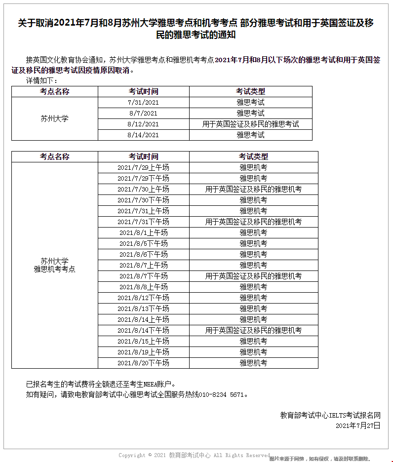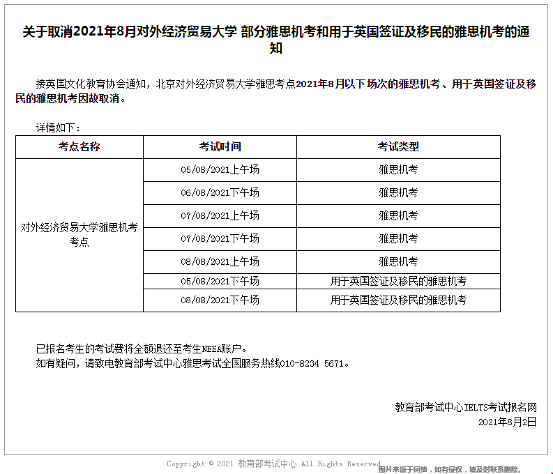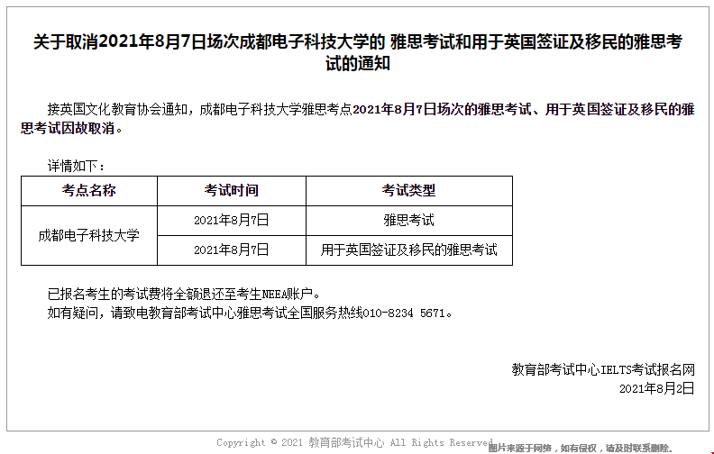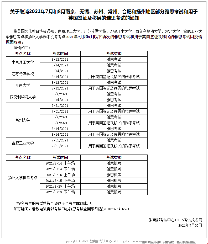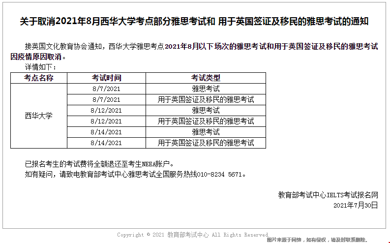 8月7日雅思考试;8月12日,用于英国移民签证的雅思考试;8月14日雅思考试。