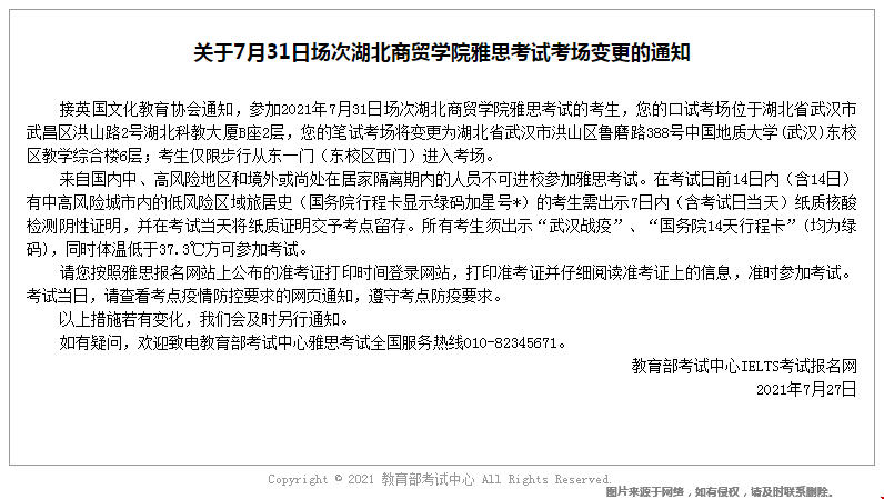 参加7月31日场次的同学,口试考场现在为:湖北省武汉市武昌区洪山路2号湖北科教大厦B座2层;笔试考场变更为:湖北省武汉市洪山区鲁磨路388号中国地质大学(武汉)东校区教学综合楼6层;考生仅限步行从东一门(东校区西门)进入考场。
