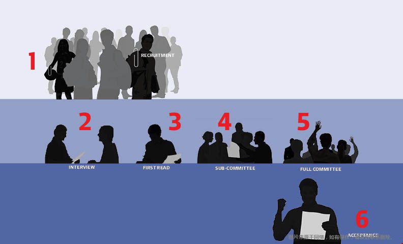 Committee)。全体招生委员会由40名申请资料审阅人组成。小组委员会的绝大多数成员都必须对申请人投赞成票,申请人才能进入下一阶段。全体招生委员会至少对每份申请进行再一次仔细审阅和投票。全体招生委员会也遵守多数原则。