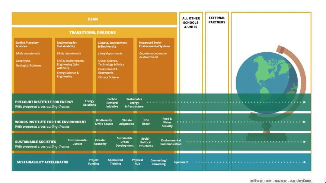 根据学校委员会的建议,新学院将专注于气候和可持续发展问题。在部门结构上将容纳几个现有的学术部门和研究机构,包括: