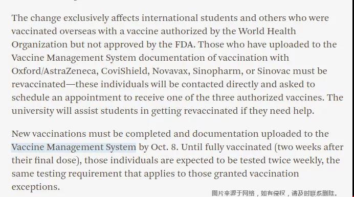 这一变化只影响国际学生和其他在海外接种了世界卫生组织授权但未经FDA批准的疫苗的人。如果学生需要帮助,大学将帮助他们重新接种疫苗。