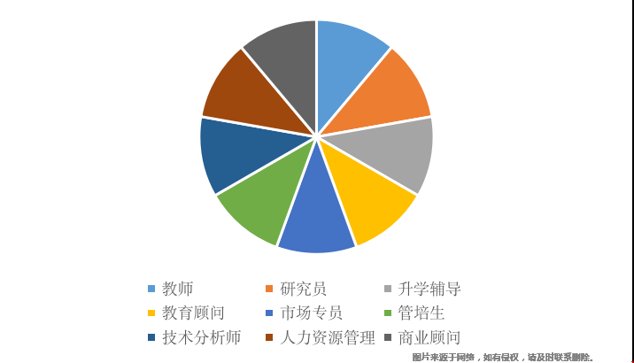 毕业生就业去向主要涉及到教育培训、咨询、学术研究及商务四个行业。教育培训行业仍是毕业生就业的首选。